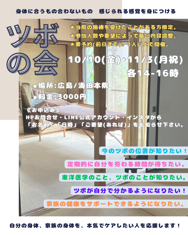 ・当院の施術を受けたことのある方限定。身体に触れる感覚、ツボを探す感覚を磨いていく会です。・参加者同士でお互いの身体に触れながら、私もチェックしたりアドバイスしたりで加わりながら、本格的に、定期的に、と思っています。・3名以上の参加で実施します。▪️日時:10/10(金)11/3(月祝) 各14:00-16:00▪️場所:広島/海田本院にて▪️参加費:3000円