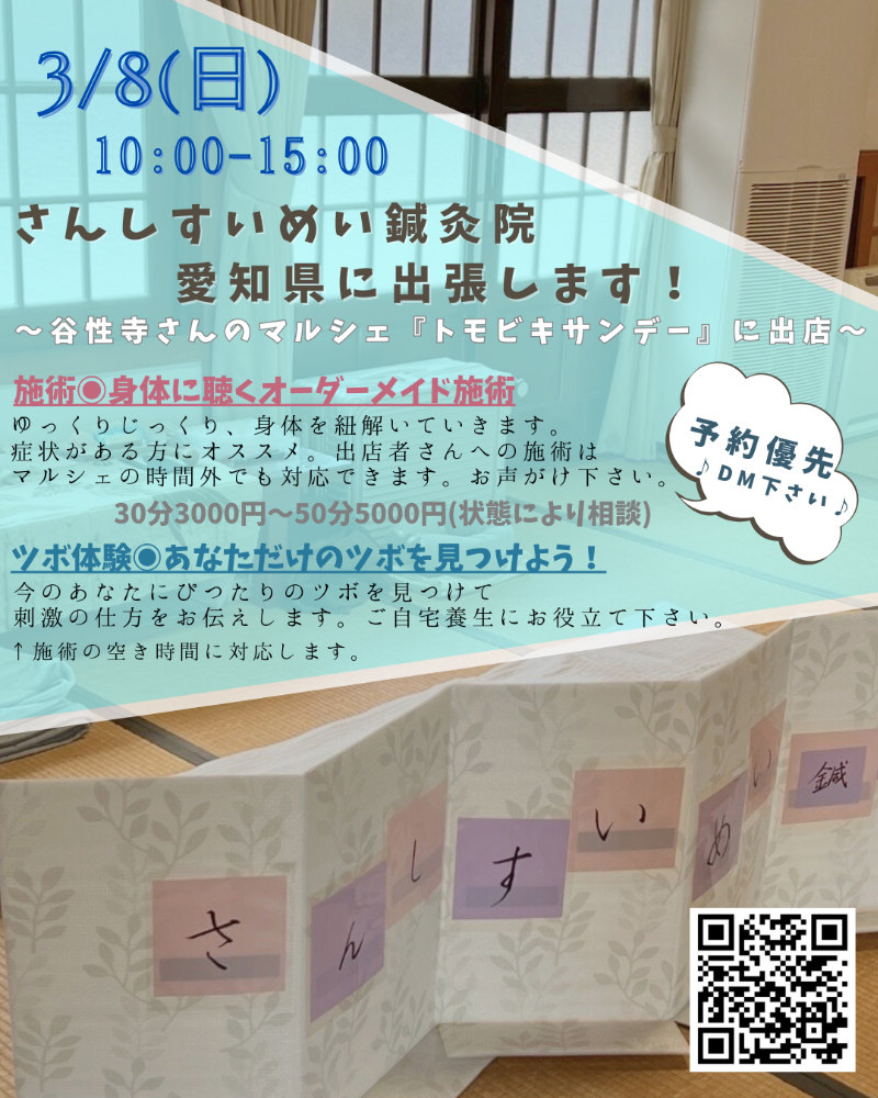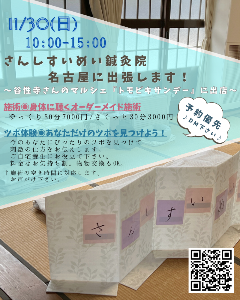 ・お寺のマルシェ「トモビキサンデー」に出店します。選りすぐりの出店者さん達の作る和やかな雰囲気の中、私も私らしく、身体に聴くオーダーメイド施術を提供してきます♪