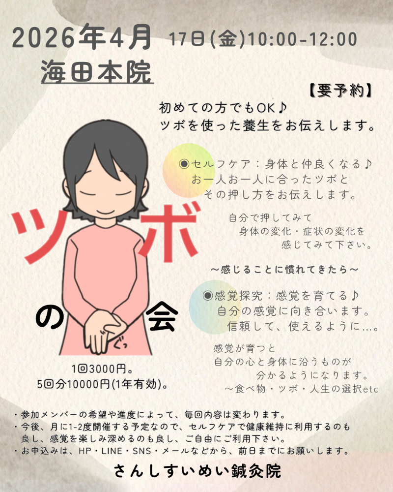 ツボを使った養生&感覚探究の会です。月1-2回の開催。毎回参加者により内容変わります。◉セルフケア:お一人お一人に合ったツボと、その押し方をお伝えします。◉感覚探究:自分の感覚に向き合います。感覚への信頼を育て、身体に合うツボを見つけたり、心に沿う選択ができるようにサポートします。▪️日時:4/17(金)10:00-12:00▪️場所:広島/海田本院にて▪️参加費:1回3000円・5回分10000円※初めての方OK。要予約(前日まで)。